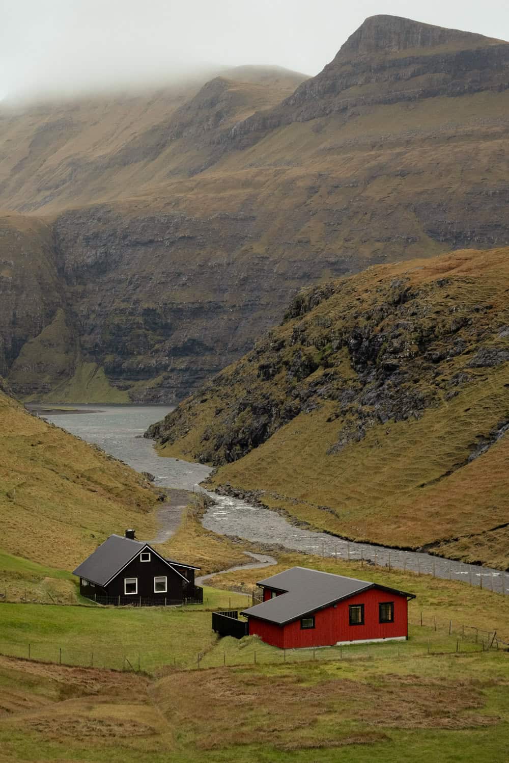 Saksun sits at the end of a long, dramatic valley surrounded by steep mountains. Waterfalls spill down the cliffs after rain. The lagoon shifts with the tides. When the clouds hang low, the peaks fade into mist and everything feels soft and moody.